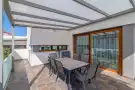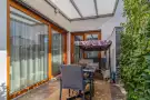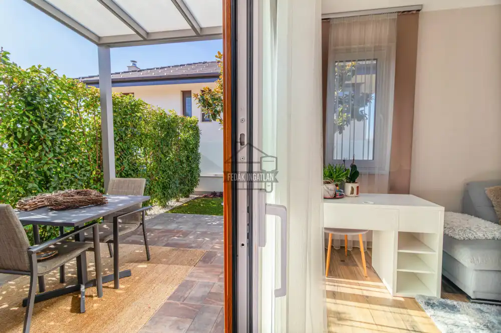 The unique design of the house: two separate entrances, two full-fledged apartments. In the larger apartment, parents and child(ren) have their own realm - with a bathroom and bedroom. In addition to the large living room with an American style kitchen, the terrace with a pergola opening from it also provides opportunities for family and friends to gather. The smaller apartment, which has its own garden and terrace, can accommodate grandparents, independent children, or even a domestic worker.