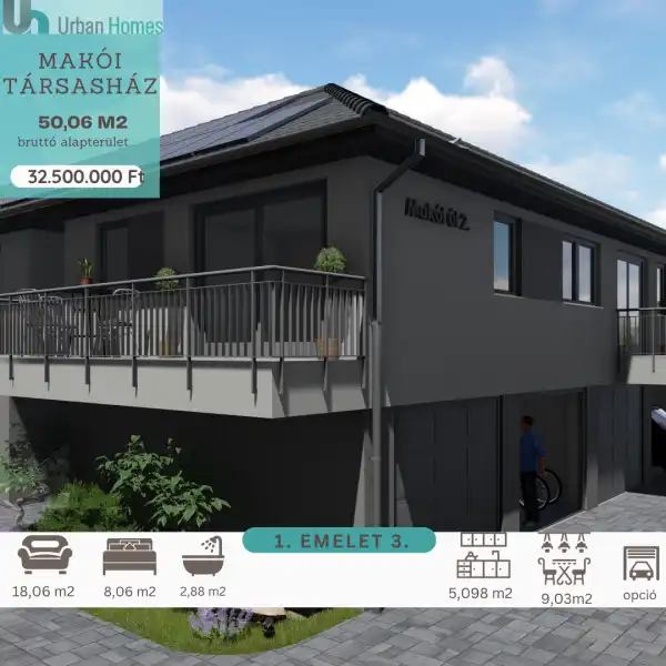 1. emelet 2. számú lakás nappali: 18,06 m2 konyha: 5,98 m2 háló: 8,06 m2 fürdő: 2,88 m2 WC: 1,44 m2 közlekedő: 4,14 m2 terasz: 10,42 m2...