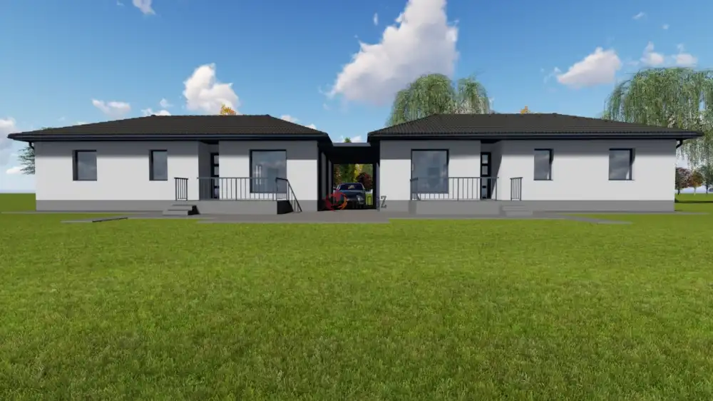 A belső ajtók igényes szép darabok 85ezer/db. az árban. Szaniterek 450.000.HUF.-ig a vételárban. Viacolor járda, 20 nm. gépkocsi beálló . A két lakás külön udvarrésszel és bejáratokkal rendelkezik. A lakások NEM érintkeznek egymással, a tető kerül összeépítésre. A két épületrész közt