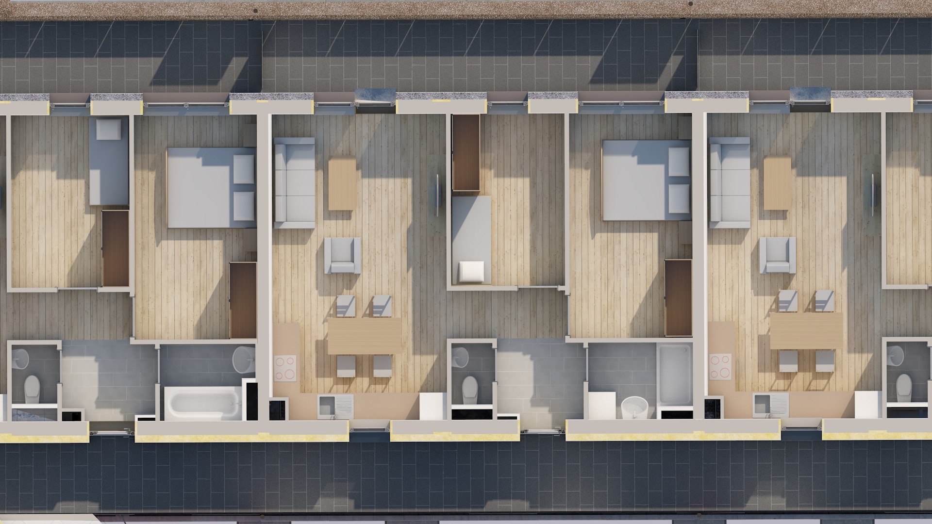 A modern megjelenés, a gondosan kialakított közös terek és a minőségi anyaghasználat egy rendezett, kényelmes mindennapokat biztosító otthont eredményez.