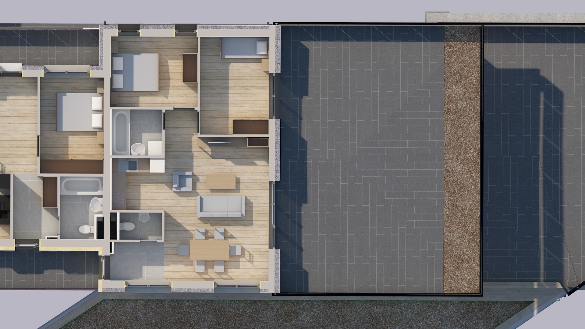 A modern megjelenés, a gondosan kialakított közös terek és a minőségi anyaghasználat egy rendezett, kényelmes mindennapokat biztosító otthont eredményez.